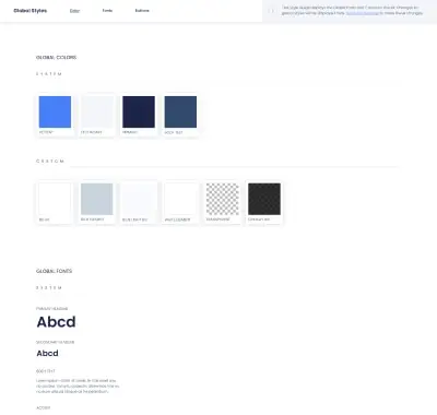 Global Styles Colors Fonts buttons This page previews Global Fonts and Colors for this Kit. Changes made in Site Settings will be displayed here. Global Colors SYSTEM Primary Secondary Body text accent custom BG kIt Blue Element Blue Light BG …